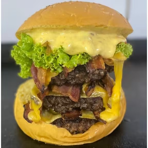 Pão Monstro, 3 Hambúrgueres Artesanais De 140g Cada, 3 Queijo Cheddar , 3 Bacon, Alface, Tomate, Cebola Caramelizada, Maionese Amarela ou Creme De Milho