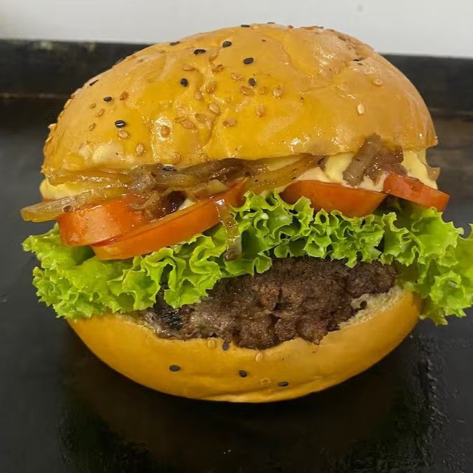 Pão monstro, 140g de hambúrguer artesanal, queijo prato, alface, tomate, cebola caramelizada, maionese amarela ou creme de milho