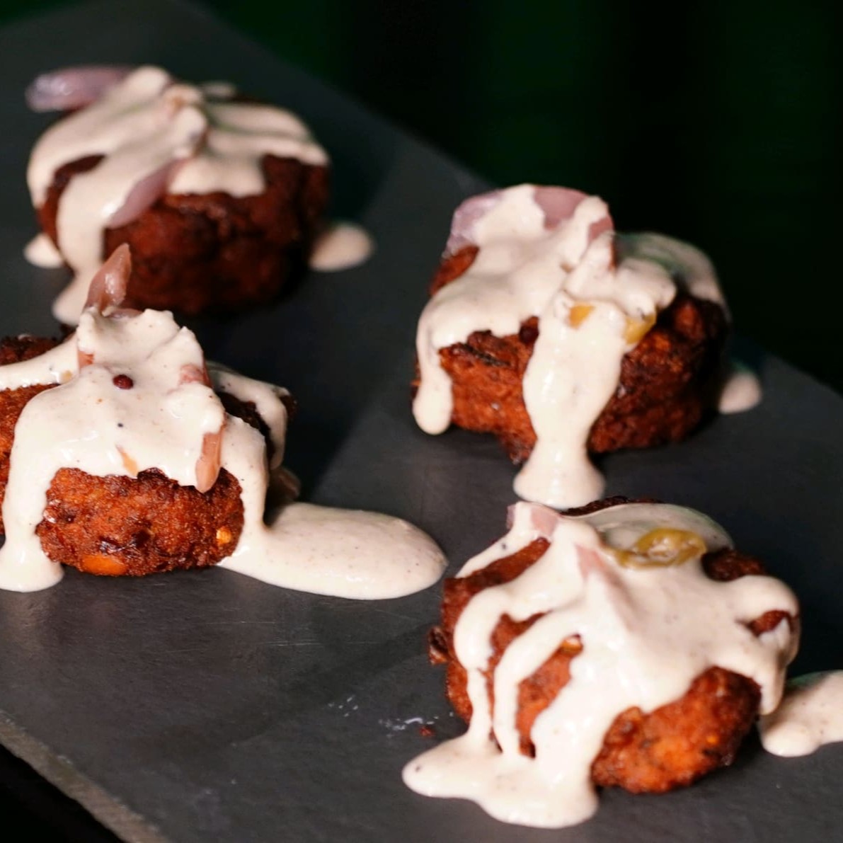 Bolinhos fritos de feijão preto, acompanhado de maionese de tofu com alho| Sem glúten intencional.