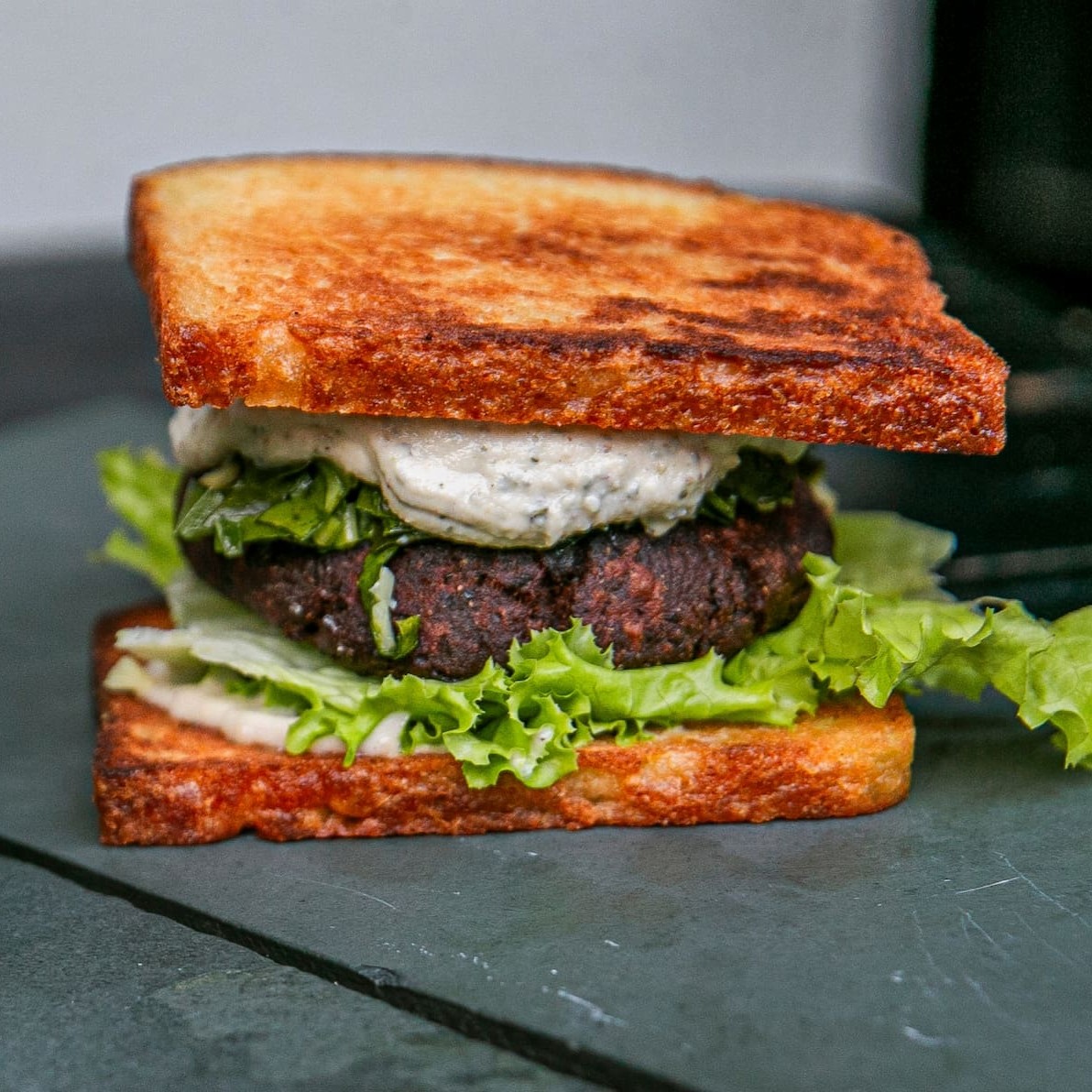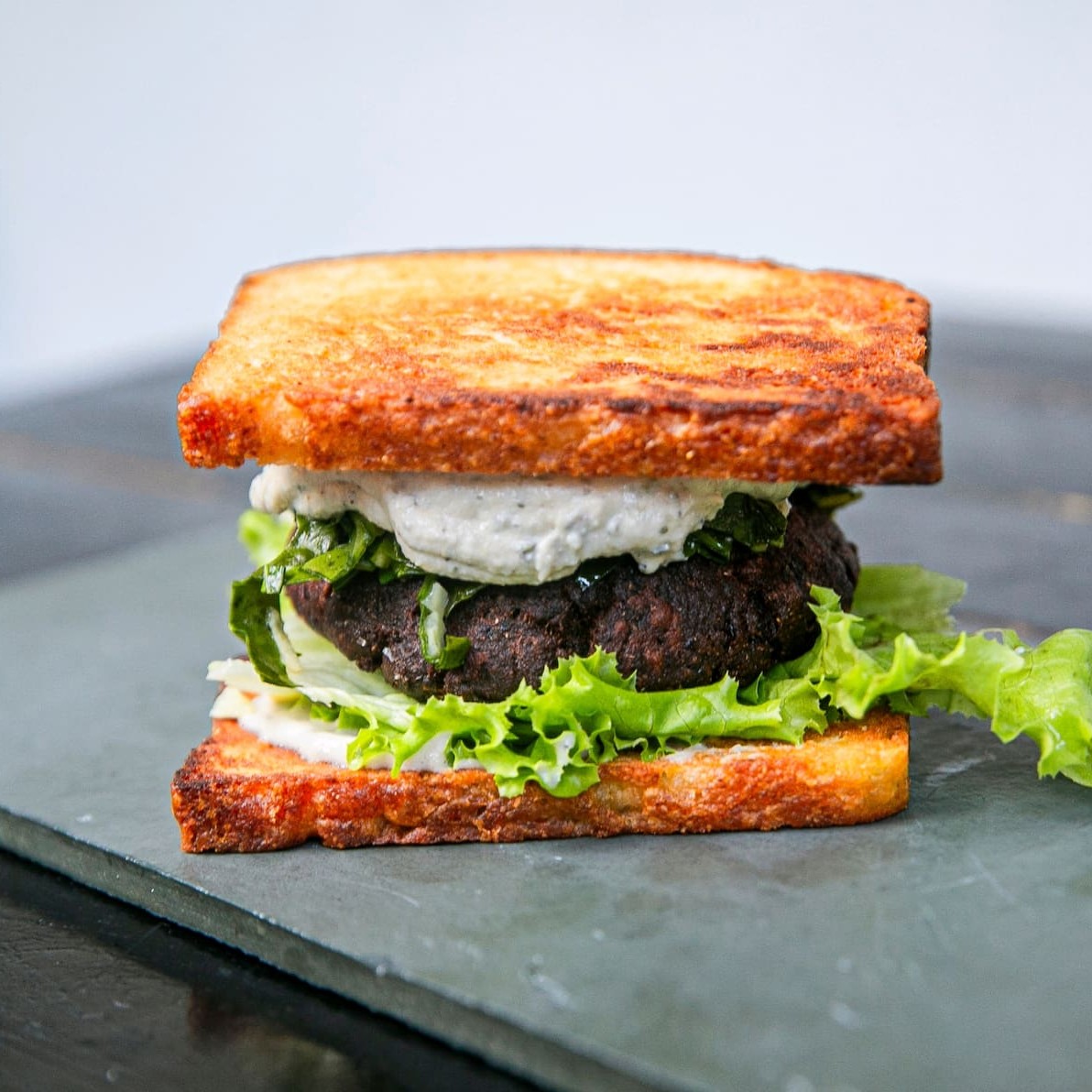 Pão de caixa sem glúten chapeado, disco frito de feijão preto, couve folha refogada no alho, maionese de tofu com alho, creme de castanha e folhas.