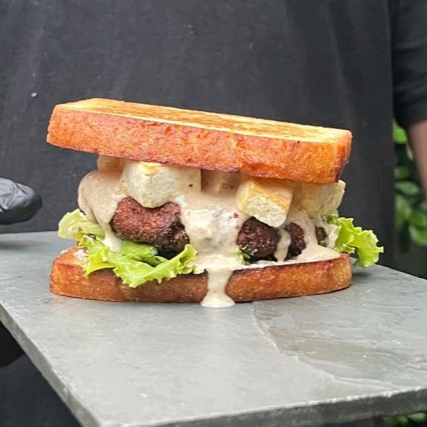 Pão de caixa chapeado, disco frito de falafel, cubos de tofu frito, molho tahine, creme de castanha e folhas
