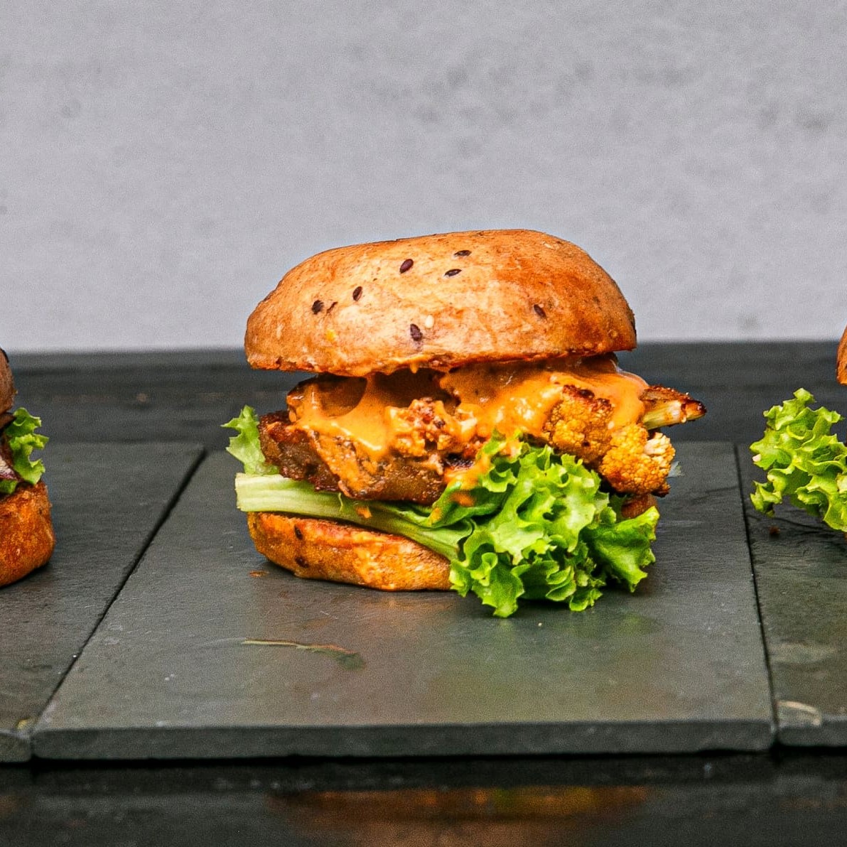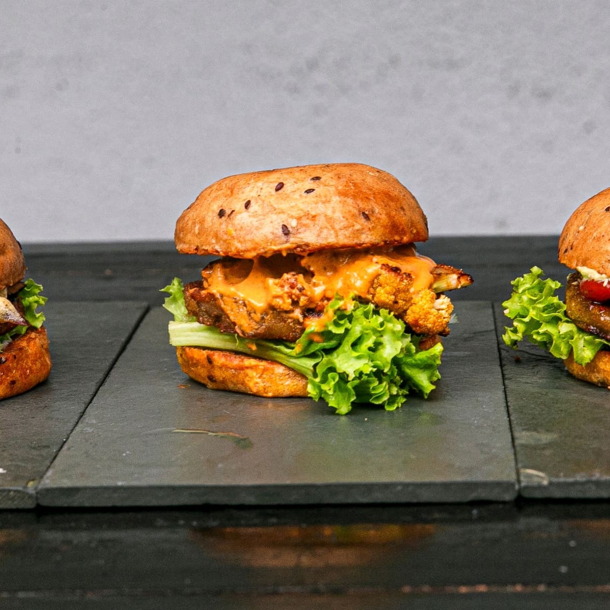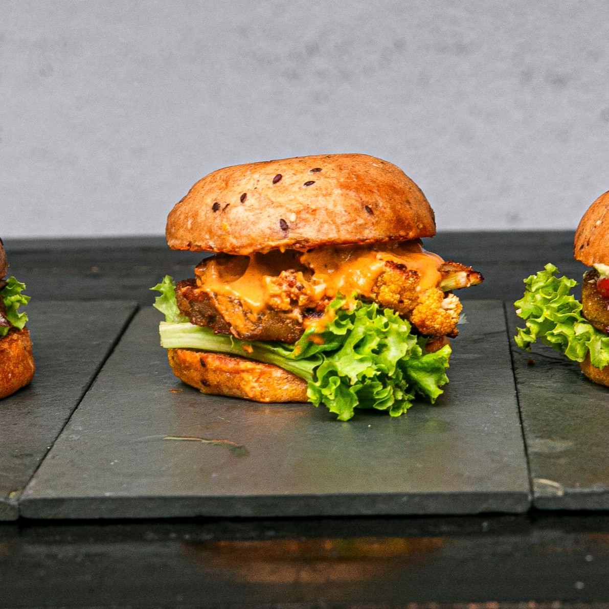 Blend de Beringela defumada e feijão fradinho. Couve flor refogada com páprica defumada; molho de pimentões vermelhos defumados (muhammara); creme de castanha e folhas no pão bola integral.