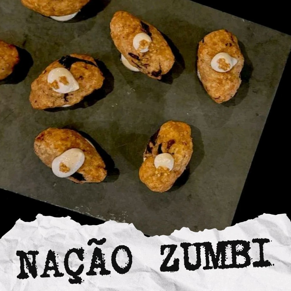 Blend de feijão preto. Picles de pimenta de cheiro, cebola roxa e semente de coentro; molho chilli; crispy de batata doce; creme de castanha e folhas no pão bola integral.