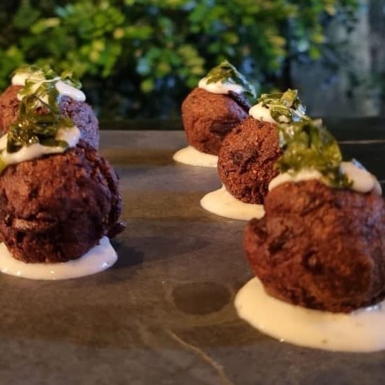 Falafel frito acompanhado de molho tahine.| Sem glúten intencional.