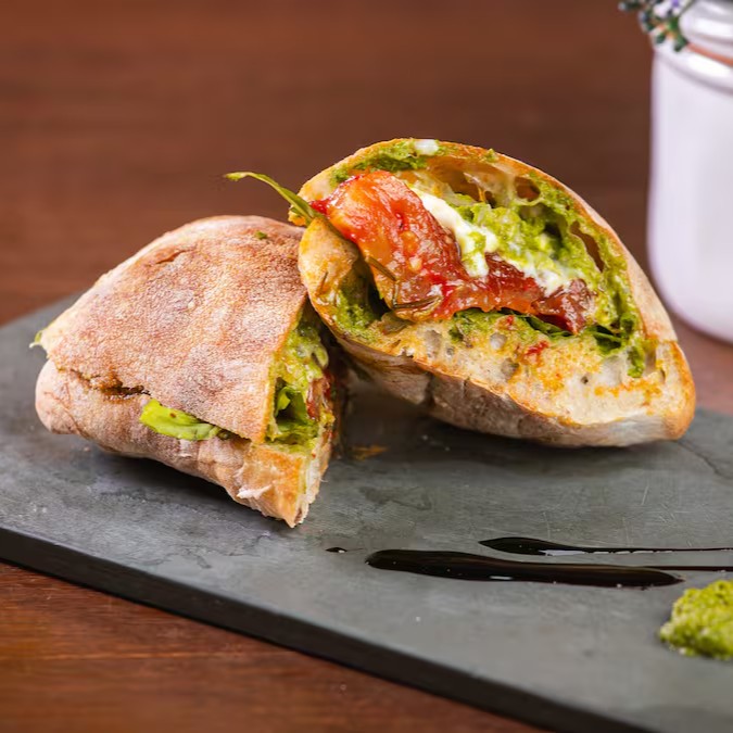 Feito com pão da casa, pesto, rúcula, manjericão, tomate assado e mussarela de búfala. É uma combinação saborosa e texturizada, perfeito para qualquer hora do Dia.