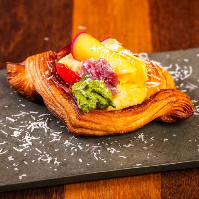 Massa semi-folhada leve e crocante, coberta com queijo do reino, picles de cebola e pepino, húmus e pesto fresquinho. Uma combinação única e sofisticada de sabores que vai transformar seu lanche em uma experiência gourmet inesquecível!