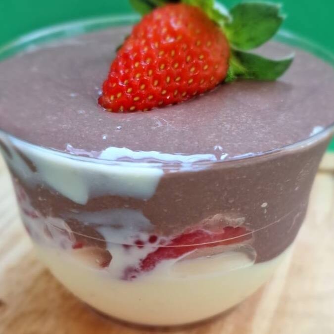 Delicioso brigadeiro de Ninho com morangos frescos e brigadeiro de cacau de colher. Sem açúcar, sem glúten e sem lactose.