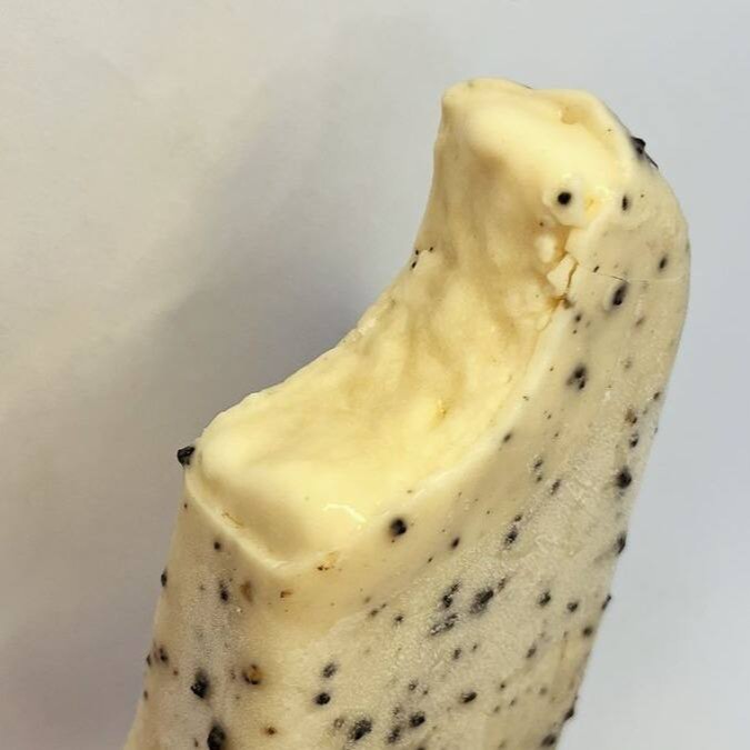 Paleta de Ninho com cobertura de chocolate branco com cookies artesanais. Zero adição de açúcar, zero glúten e apenas ingredientes naturais.