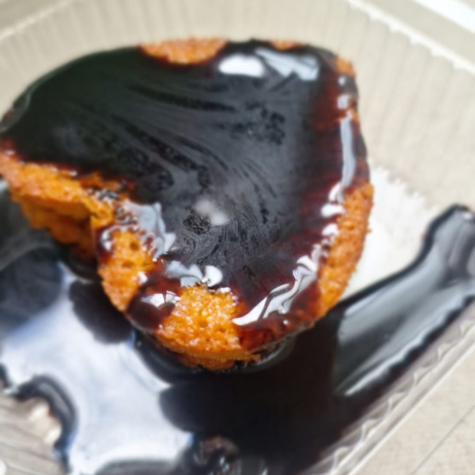 Delicioso mini bolo de cenoura em formato de coração , sem leite e sem açúcar, com cobertura de chocolate vegano.