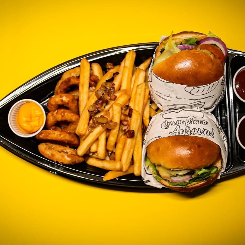 2 Nata burguer crush, pão brioche, hambúrguer bovino 110g artesanal, salada fresca com cebola roxa , queijo mussarela Original e maionese especial da casa. 1 porção de onion rings. 300g de batata fritas importada com acompanhamentos de cheddar e bacon em cubos. Barca de Hambúrguer com batata frita e anéis de cebola.