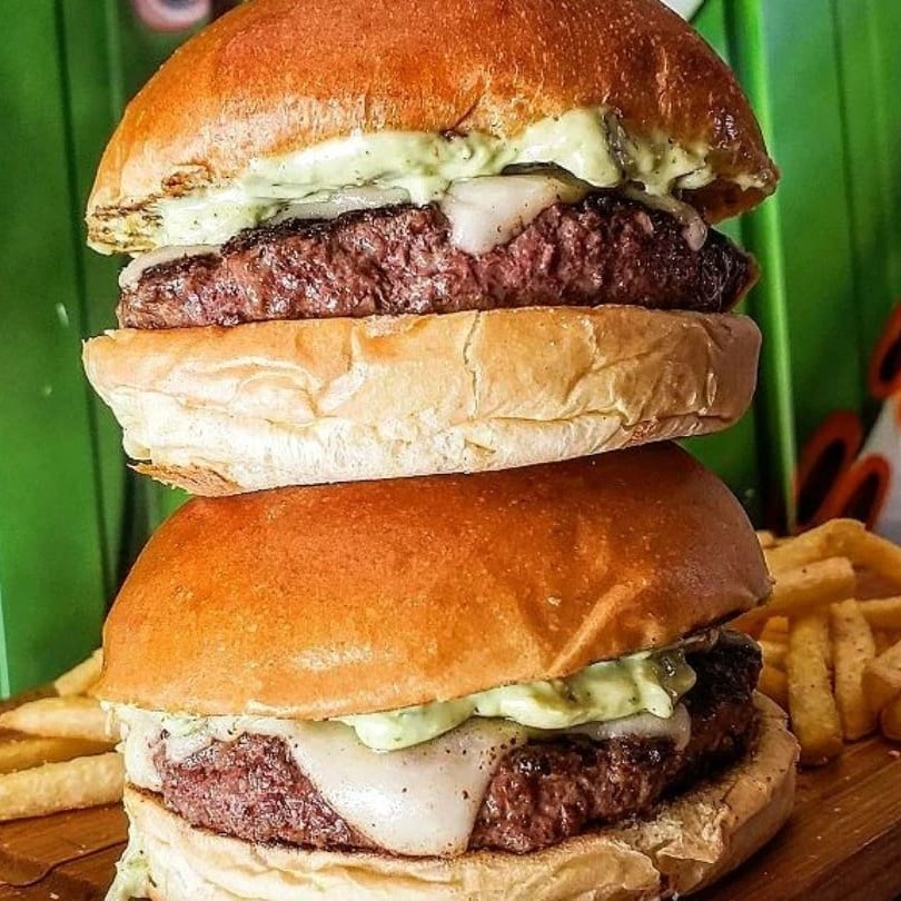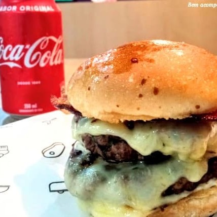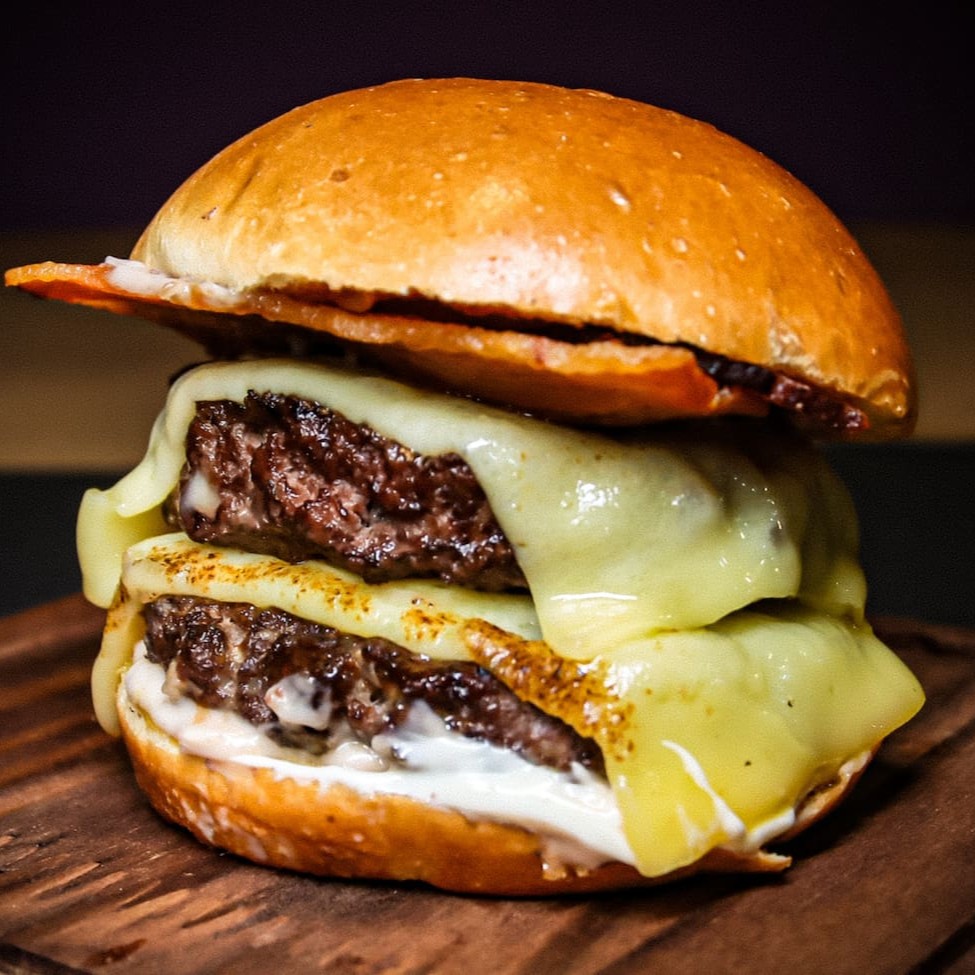 2 carnes angus de 110g coberto com 2 Fatias de queijo mussarela Original derretido, finas fatias de bacon crocante, com dois molhos a escolha no nosso pão brioche selado na manteiga. Sugestão de molho. Maionese especial e apimentado