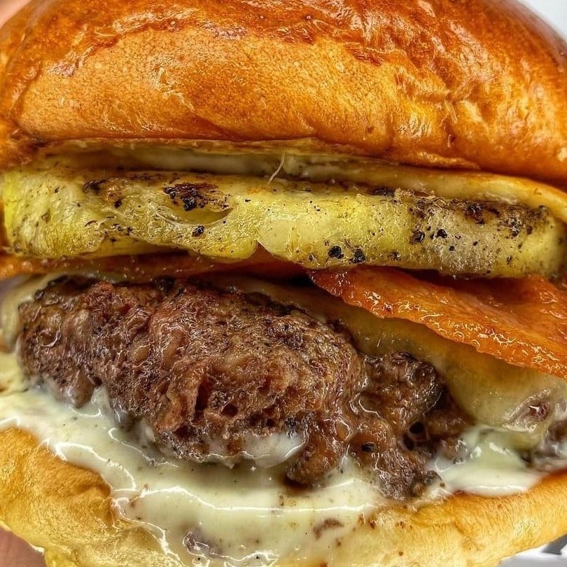 Pão brioche ou australiano, carne 150gr 100% artesanal, abacaxi grelhado, finas tiras de bacon crocante, vinagrete de cebola com salsa e escolha 2 molhos.