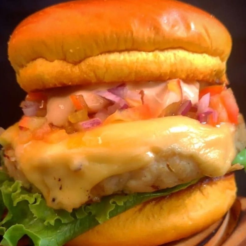 Burguer de File de peito de frango Aartesanal de 100g coberto com queijo mussarela origina, alho frito com bacon em cubos, Salada frsca(alface crocante e tomate fresco), maionese da casa no pão amanteigado selado na manteiga.
