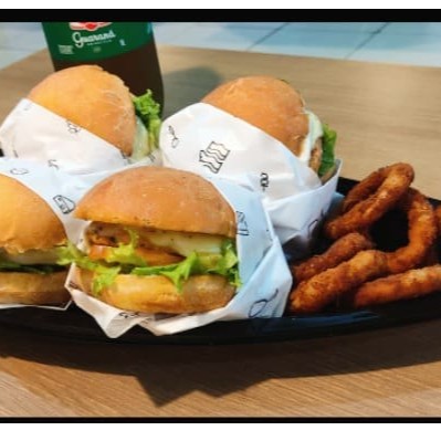 2 Nata crush, pão brioche, hambúrguer bovino 110g artesanal, salada fresca com cebola roxa , queijo mussarela Original e maionese especial da casa. 2 Burguer de File de peito de frango Aartesanal de 100g coberto com queijo mussarela origina, alho frito com bacon em cubos, Salada frsca(alface crocante e tomate fresco), maionese da casa no pão amanteigado selado na manteiga. 1 porção de onion rings. 1 Guaraná Antarctica de 1 litro