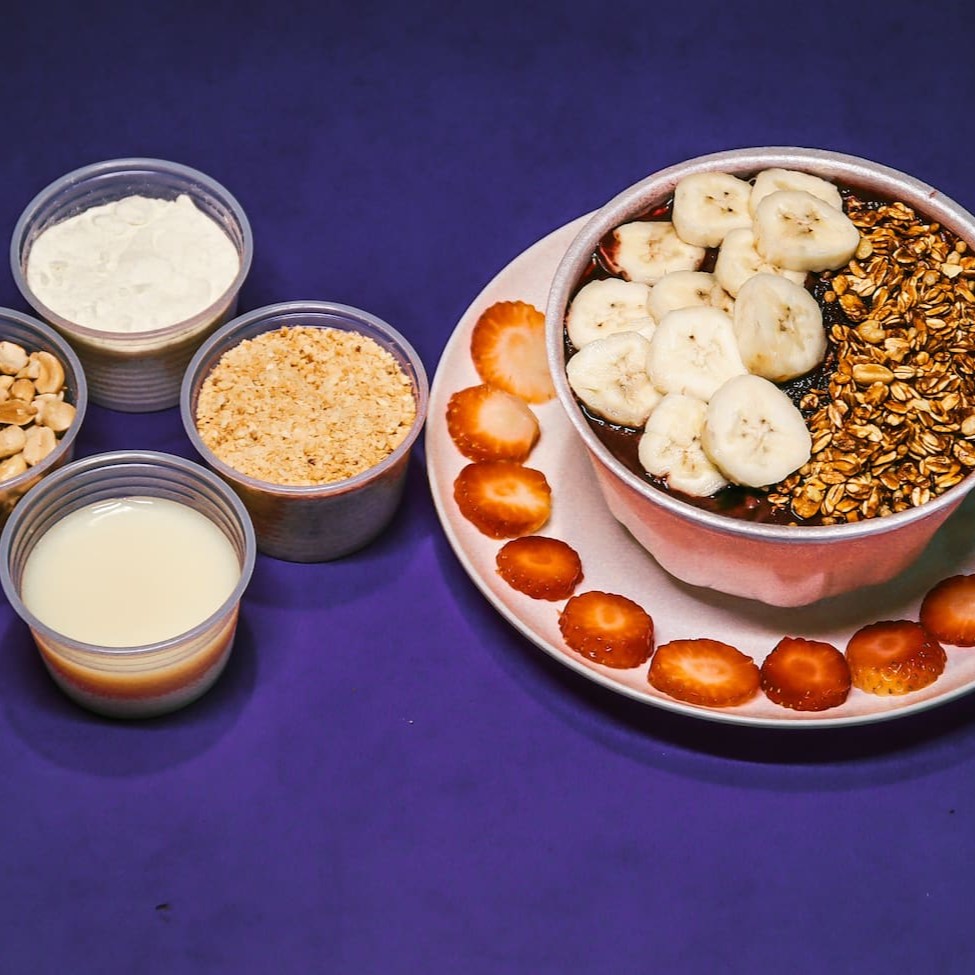 Açaí tradicional Rico em fibra e vitaminas, com 4 acompanhamentos grátis, banana, leite condensado, granola e leite em pó.