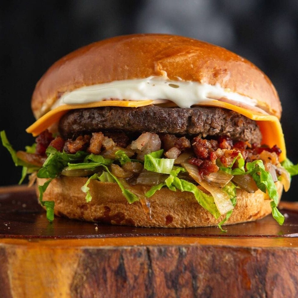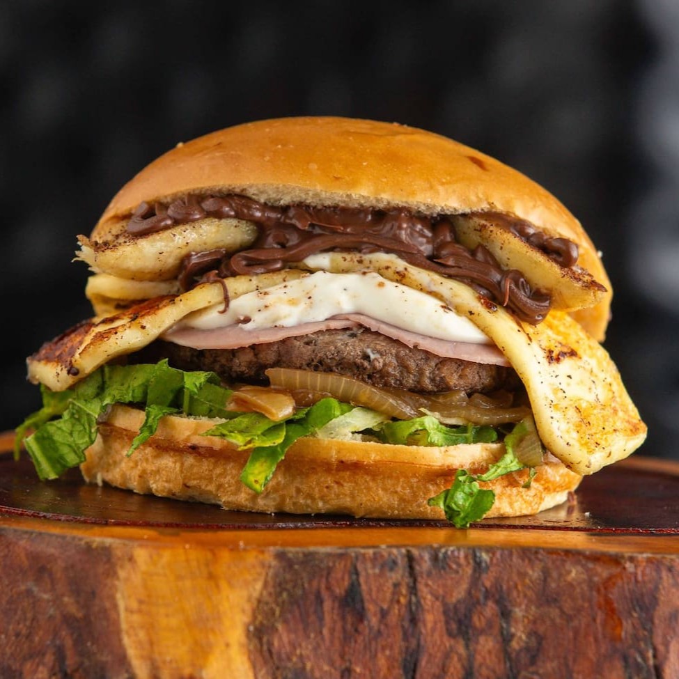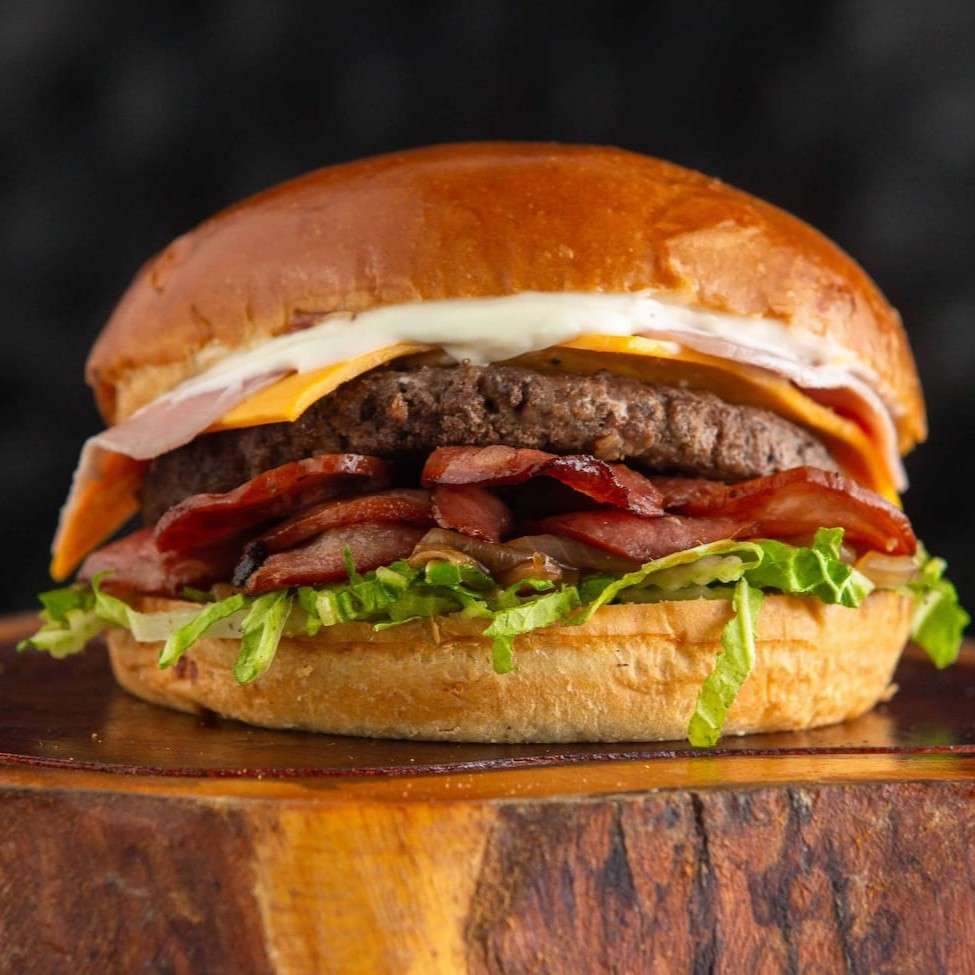 2 Cheese Bacon! Acompanhamentos em cada: pão, 100g de carne artesanal, queijo, presunto, bacon, acelga, cebola caramelizada e molho especial