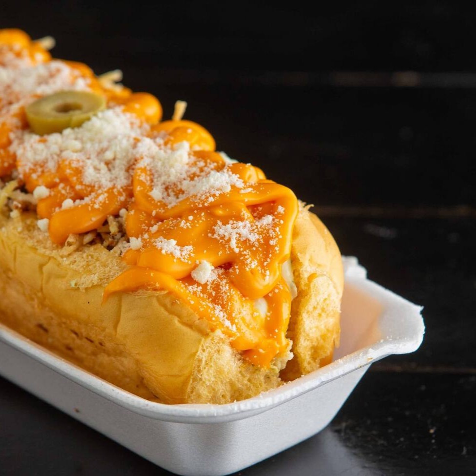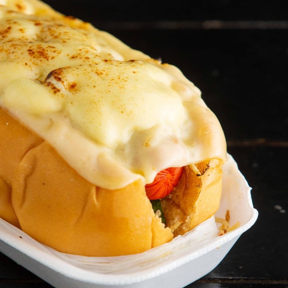 Pão de 15cm, salsicha, batata palha, molho, queijo ralado, acelga, tomate, cebola caramelizada, milho, ervilha e queijo derretido
