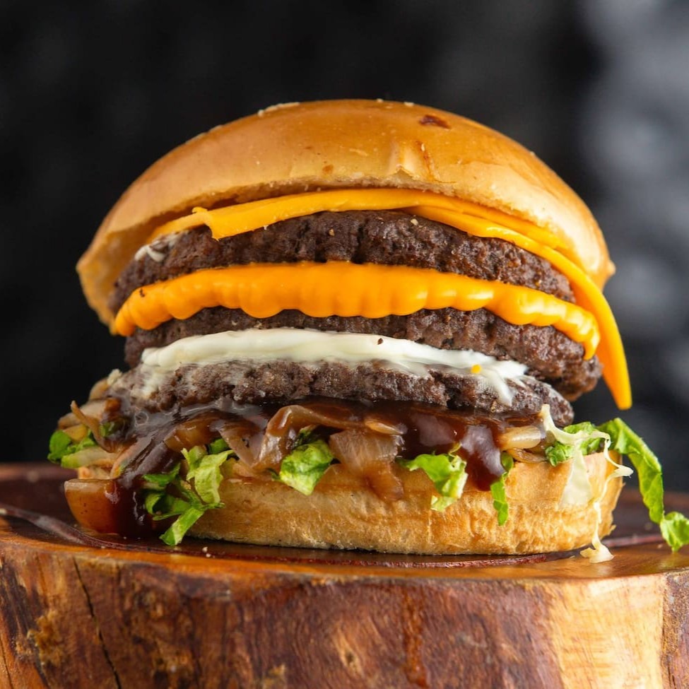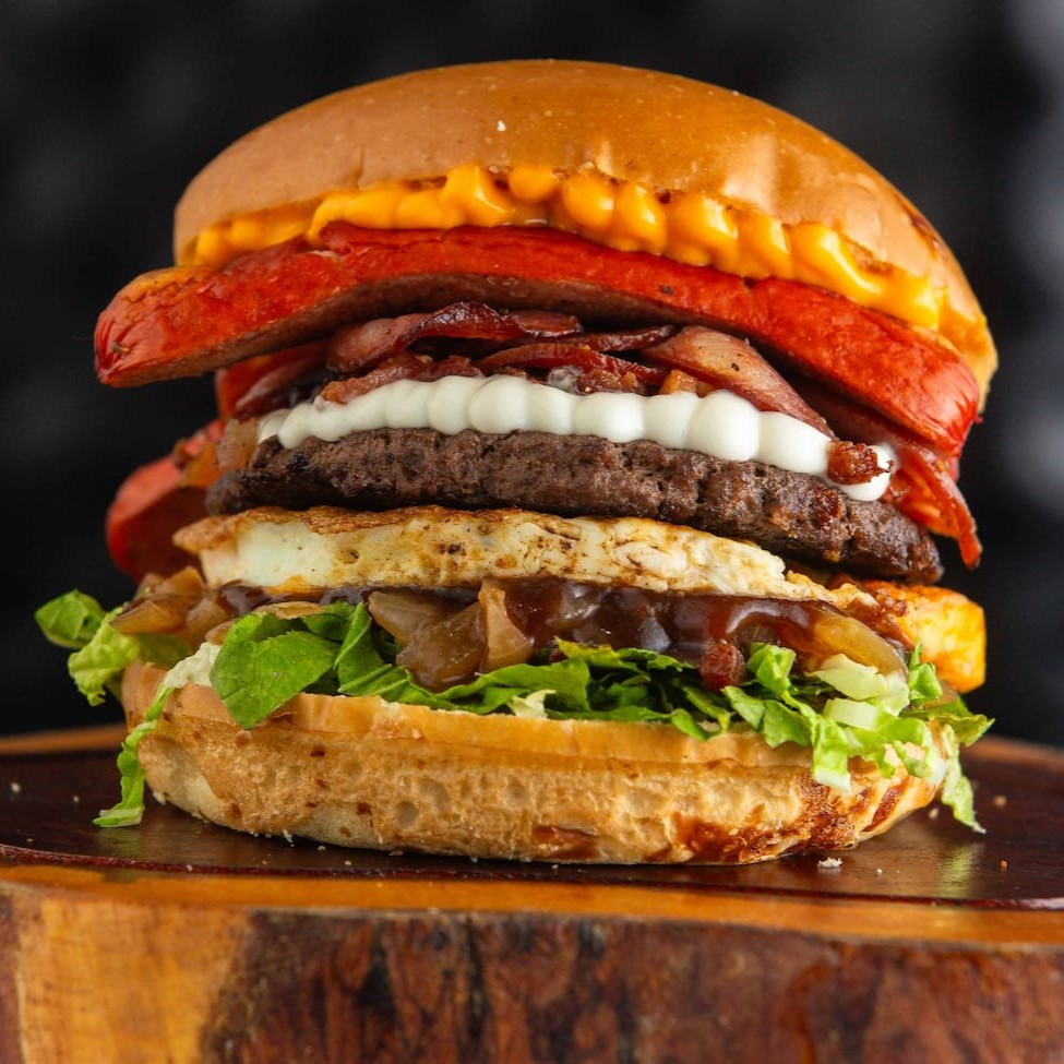 Pão, 3 carnes artesanais de hamburguer (100g cada), 3 fatias de queijo, acelga, cebola caramelizada, molho da casa, molho barbecue e molho cheddar