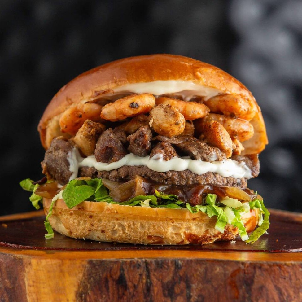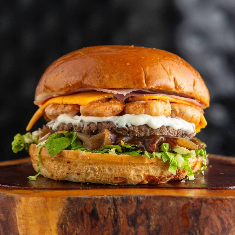 Pão, 100g de carne de hamburguer artesanal, 5 camarões, duas fatias de queijo, acelga, cebola caramelizada, cream cheese e molho especial da casa