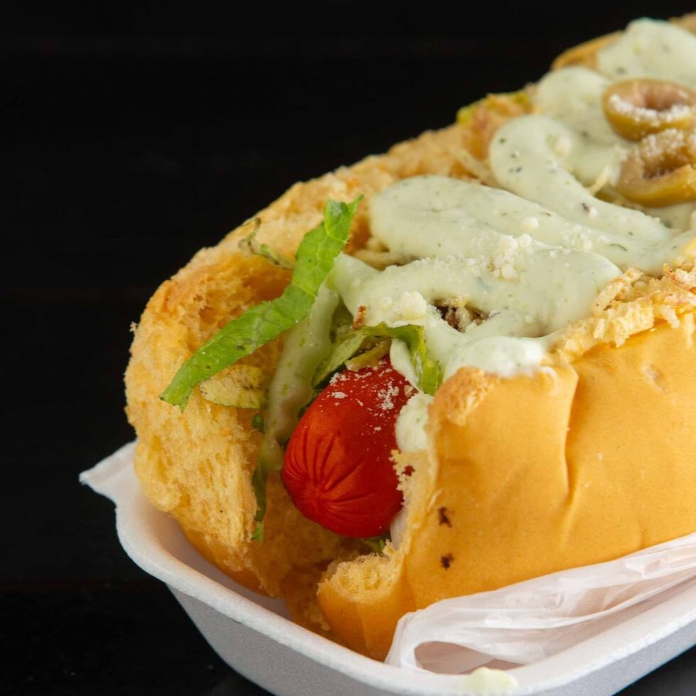 Pão de 15cm, salsicha, batata palha, molho, queijo ralado, acelga, tomate, cebola caramelizada, milho e ervilha