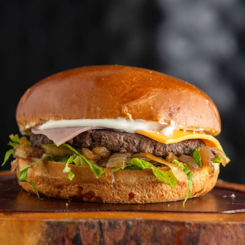 Pão, 100g de carne artesanal, queijo, presunto, calabresa, acelga, cebola caramelizada e molho especial