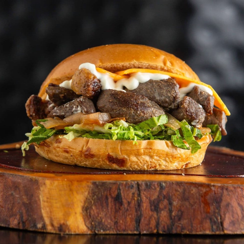 Pão, 120g de picanha em cubos, queijo, acelga, cebola caramelizada e molho especial
