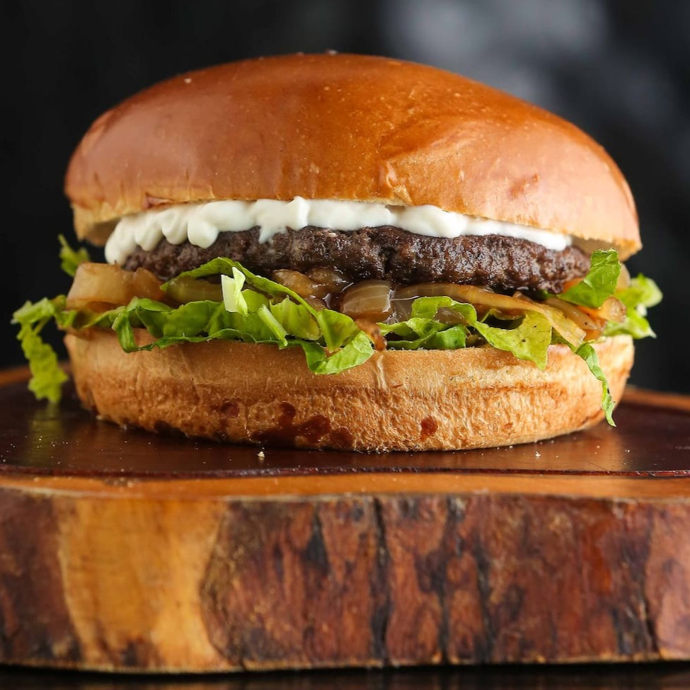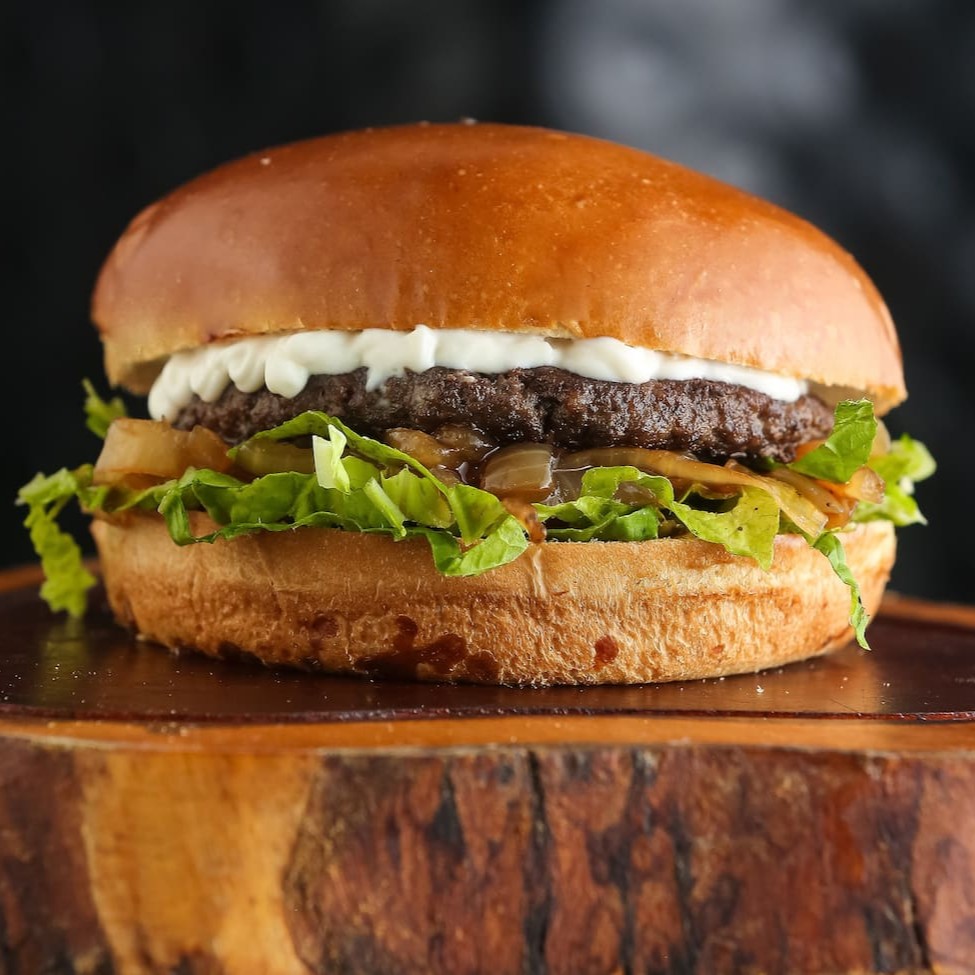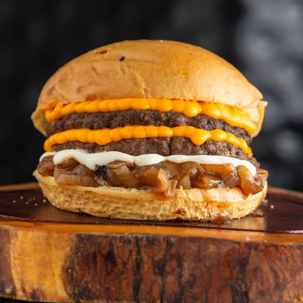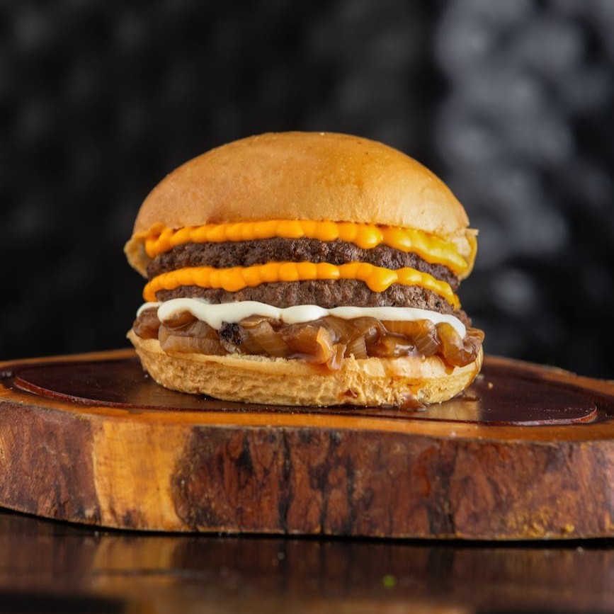 Pão, 2 carnes de hamburguer, cheddar, cebola caramelizada e molho