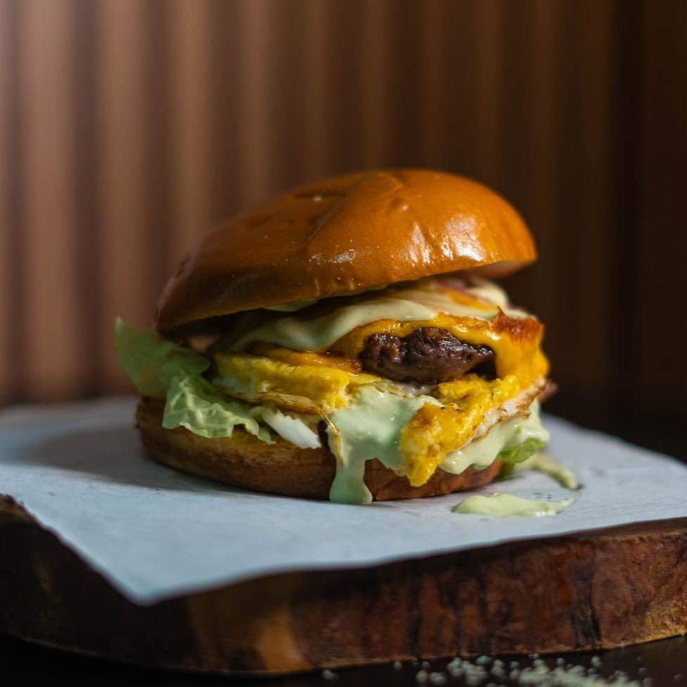 2 Cheese Egg! Acompanhamentos em cada: 100g de pão, carne artesanal, queijo, presunto, ovo, acelga, cebola caramelizada e molho especial