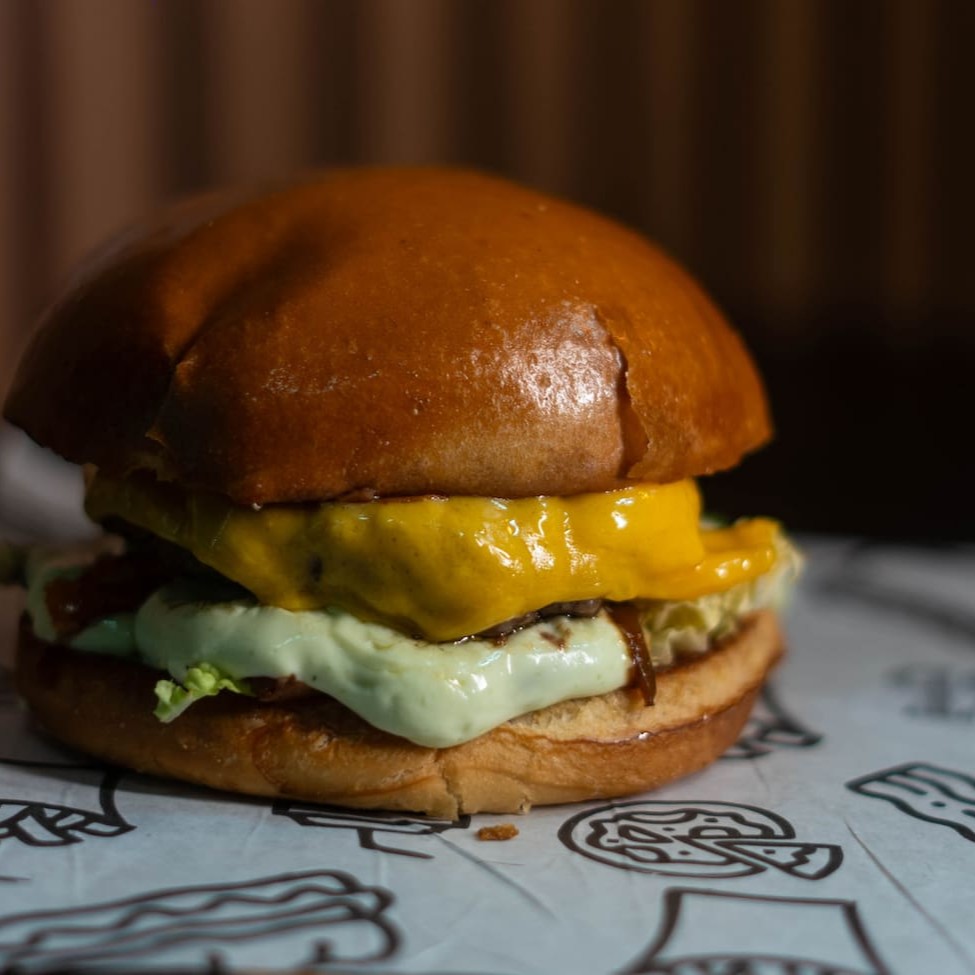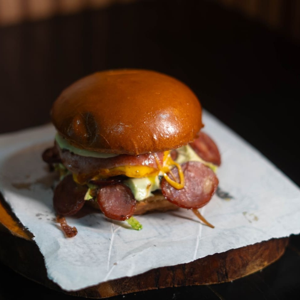 Pão, duas carnes artesanais de hamburguer (100g cada), duas fatias de queijo, acelga, cebola caramelizada, molho da casa, molho barbecue e molho cheddar