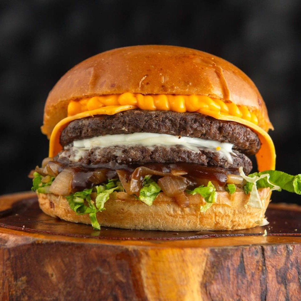 2 Cheese Duplo! Acompanhamentos em cada: pão, 2 carnes artesanais de hamburguer (100g cada), 2 fatias de queijo, acelga, cebola caramelizada, molho cheddar, molho barbecue e molho especial