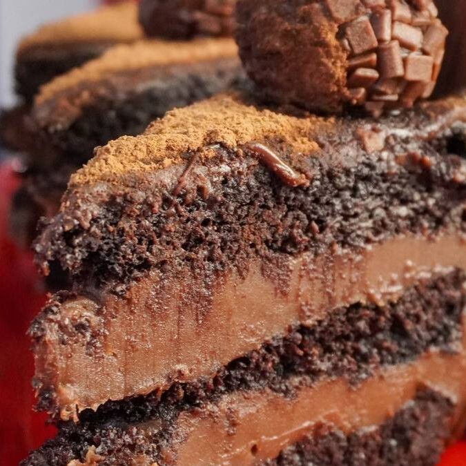 Massa dark, recheado com brigadeiro meio amargo e finalizado com ganache meio amargo, lascas de chocolate e brigadeiro ao leite.