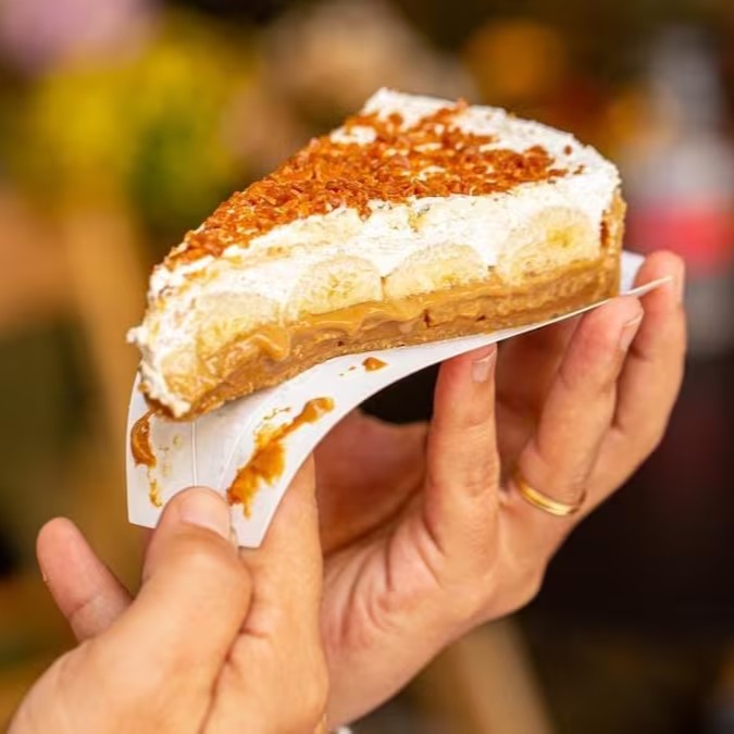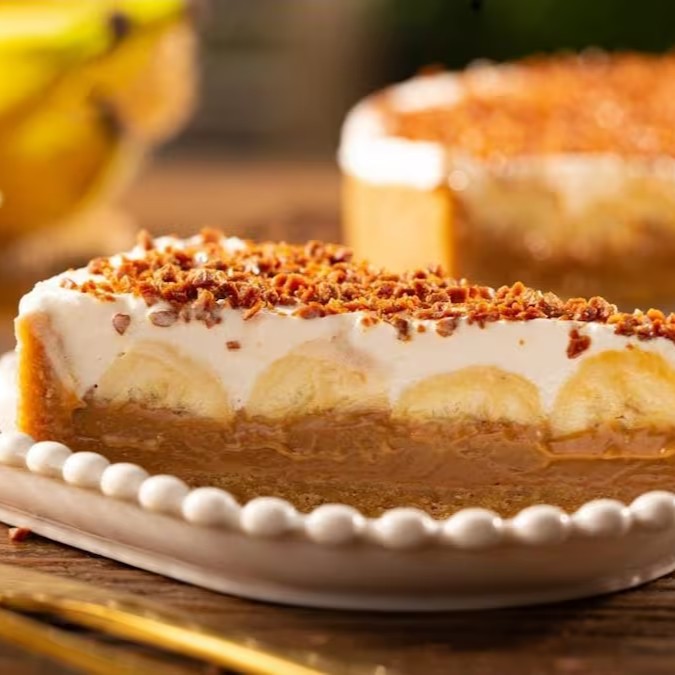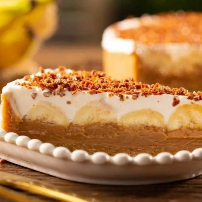 Imagina isso: base crocante de biscoito (receita secreta!), camada generosa de doce de leite artesanal, bananas fresquinhas, chantilly leve e, por cima, um crocante de caramelo salgado que derrete na boca.