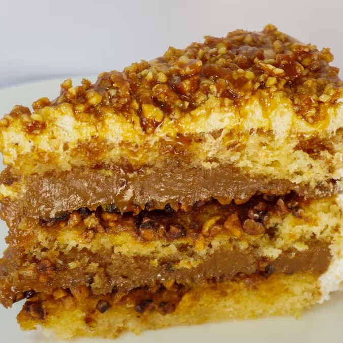Massa de baunilha, recheado com doce de leite caseiro, crocante de amendoim. Finalizado com chantilly de doce de leite.