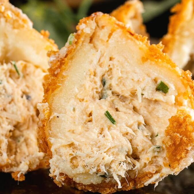 Frango desfiado e temperado com ervas e especiarias selecionadas com leve toque de cream cheese, envolto em uma massa macia e dourada.Cada coxinha é empanada em farinha panko crocante, garantindo uma textura leve e irresistivelmente crocante por fora, com um recheio suculento e cheio de sabor por dentro. Ideal para matar a fome com muito sabor — perfeita como lanche ou entrada!