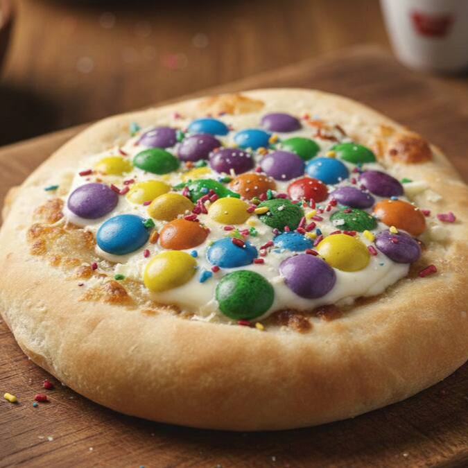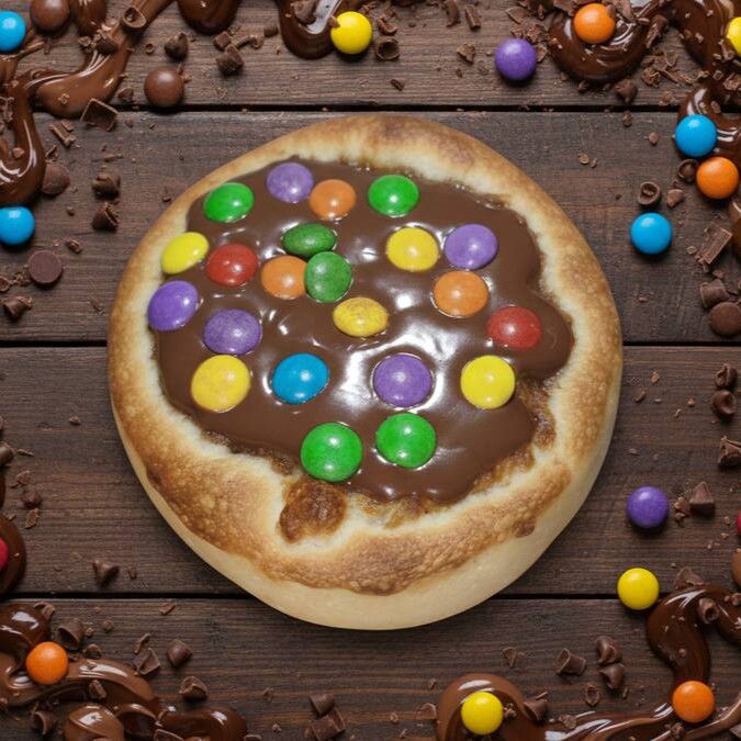 Esfiha doce com chocolate e confetes coloridos e crocantes de chocolate.