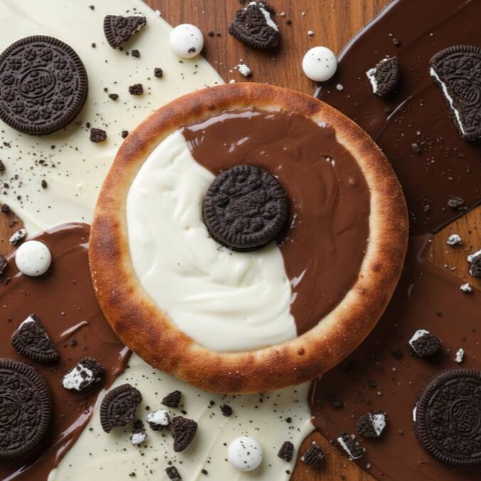Esfiha doce com o classico cholate branco tradicional Galak com pedaços de biscoito Oreo.