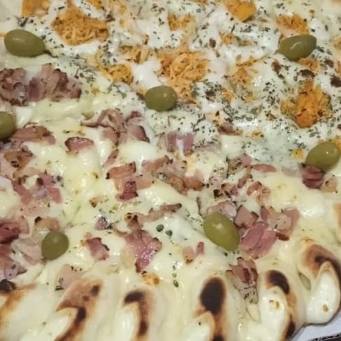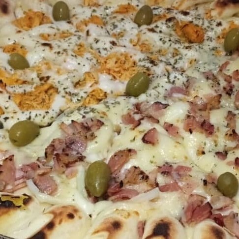 Brasileira quente: Massa, molho de tomate especial, calabresa, cebola, Catupiry, pimenta, mussarela, baycon, azeitona e orégano. Frango c/ Catupiry: Massa, molho, mussarela, frango desfiado, tomate, Catupiry, azeitona e orégano.