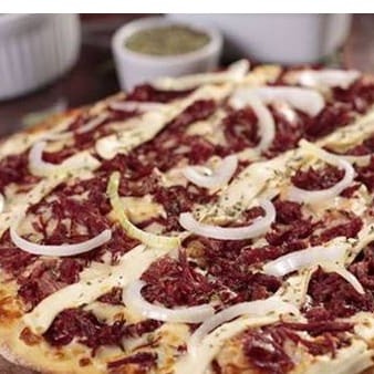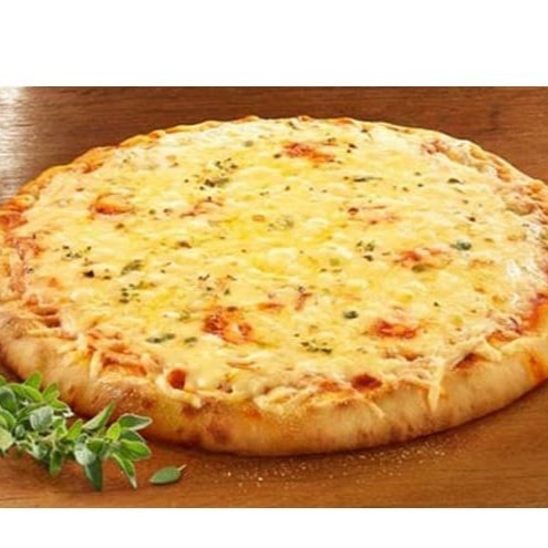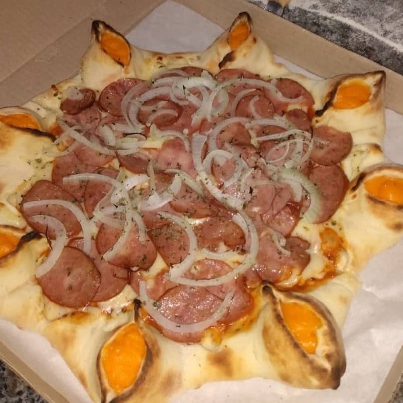 Massa, molho especial, mussarela, calabresa, tomate, cebola, cream cheese e orégano. Serve 4 pessoas.