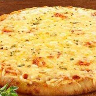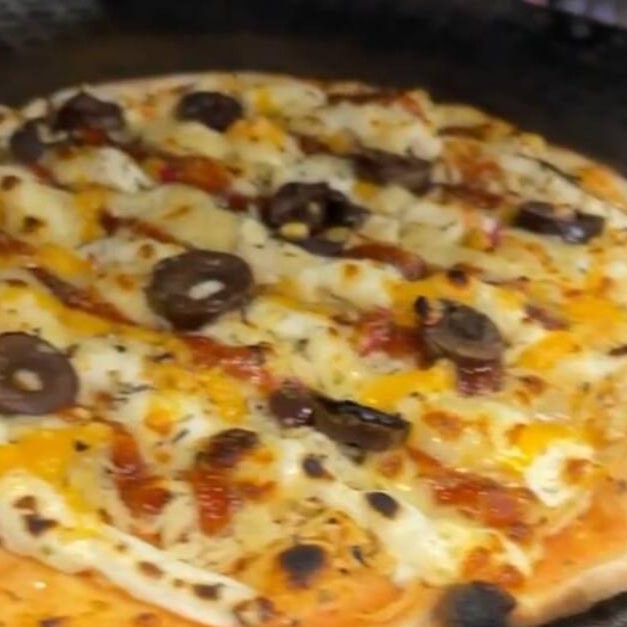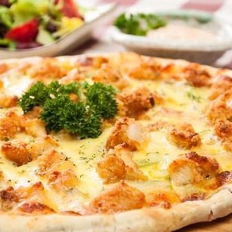 Massa, molho, mussarela, frango, provolone, azeitona e orégano.