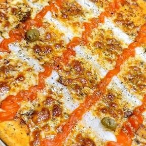 Molho de Tomate, Mussarela, Frango,Creme Cheese Azeitona e Orégano