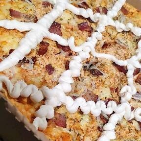 Molho de Tomate, Mussarela, Frango, Bacon, Cebola,Creme Cheese,Azeitona e Orégano