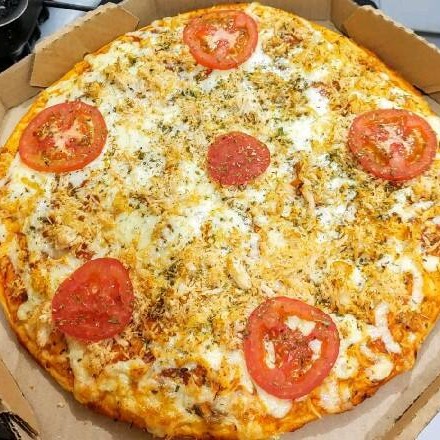 Molho de Tomate, Mussarela, Frango, Tomate, Azeitona e Orégano