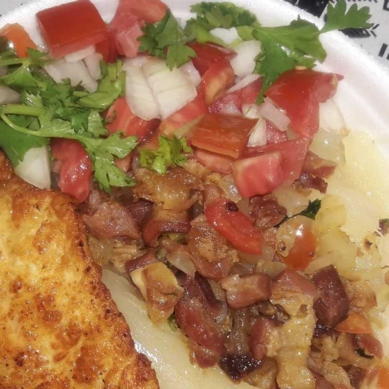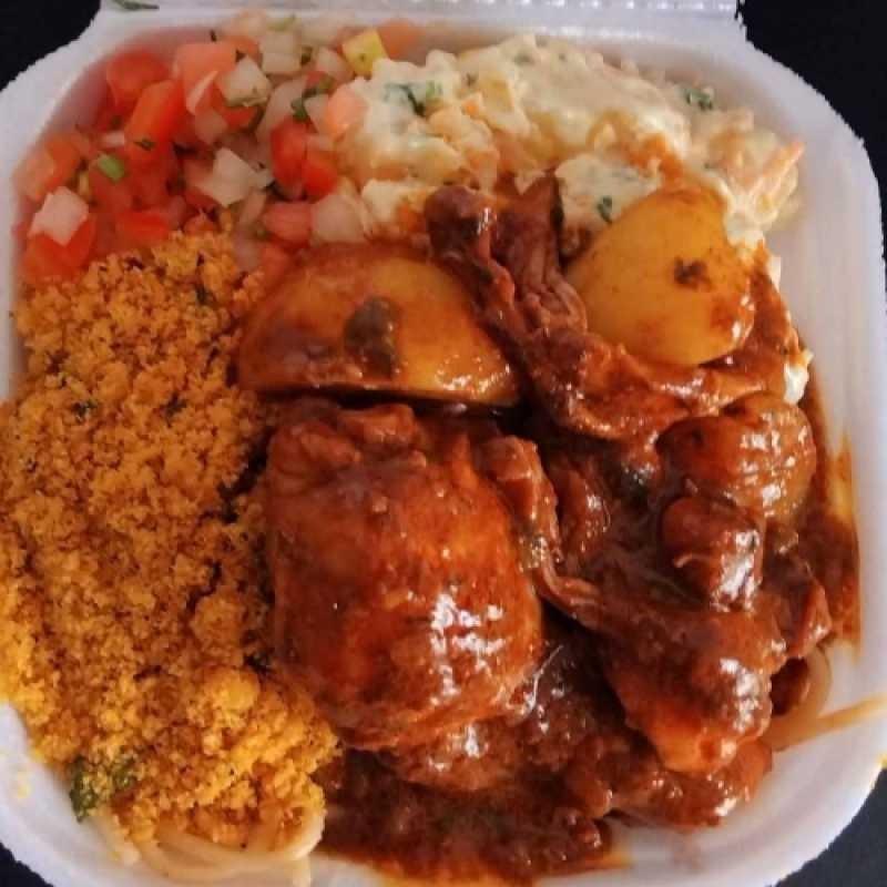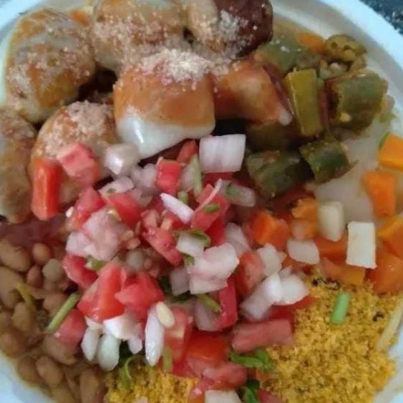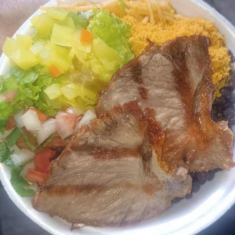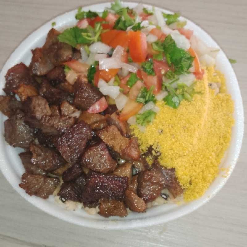 Acompanha arroz, macarrão feijão, batata frita, vinagrete, farofa e molho da casa