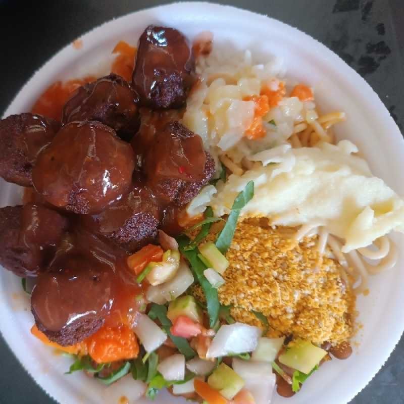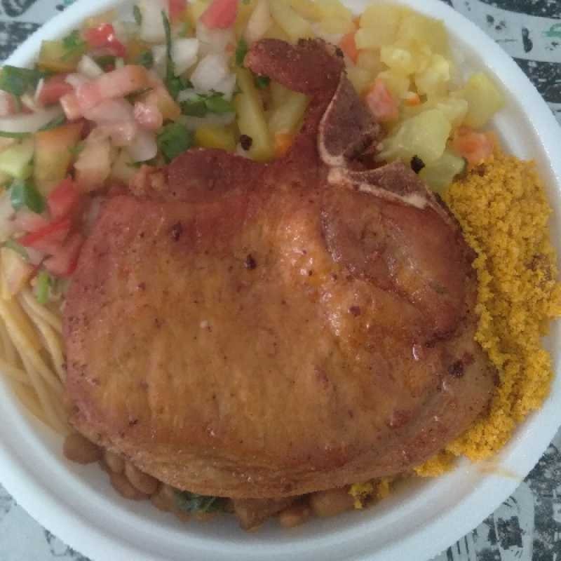Acompanha: Feijão, Arroz refogado, Macarrão espaguete, Farofa Acebolada, verduras.