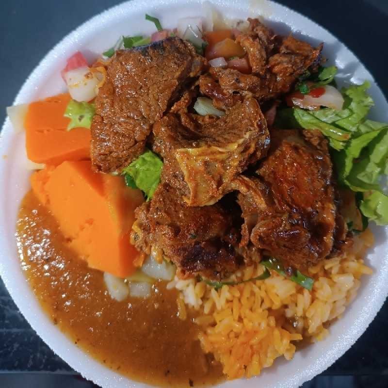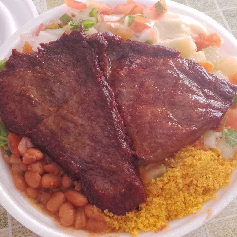 Carne cortada em tirinhas, Feijão macassar, arroz, Farofa e vinagrete.