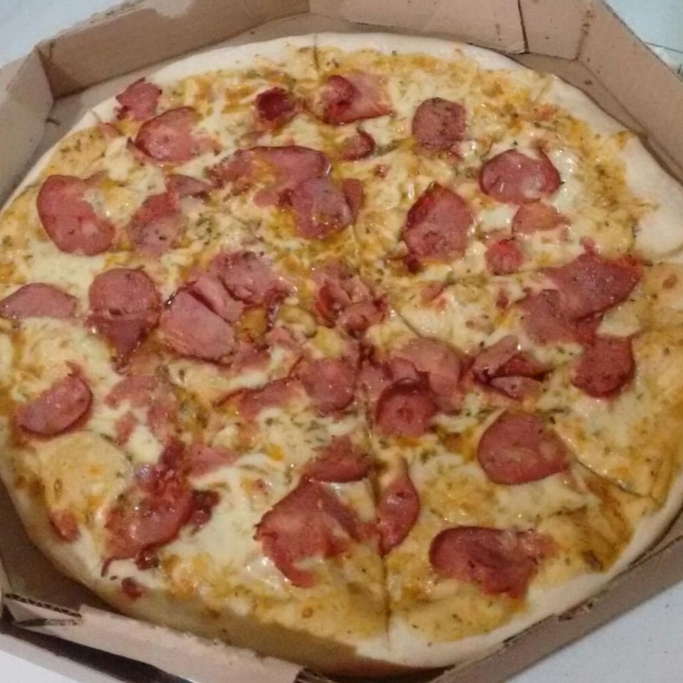 Massa, molho, queijo muçarela, calabresa, frango desfiado, atum, cebola, ovo e orégano.