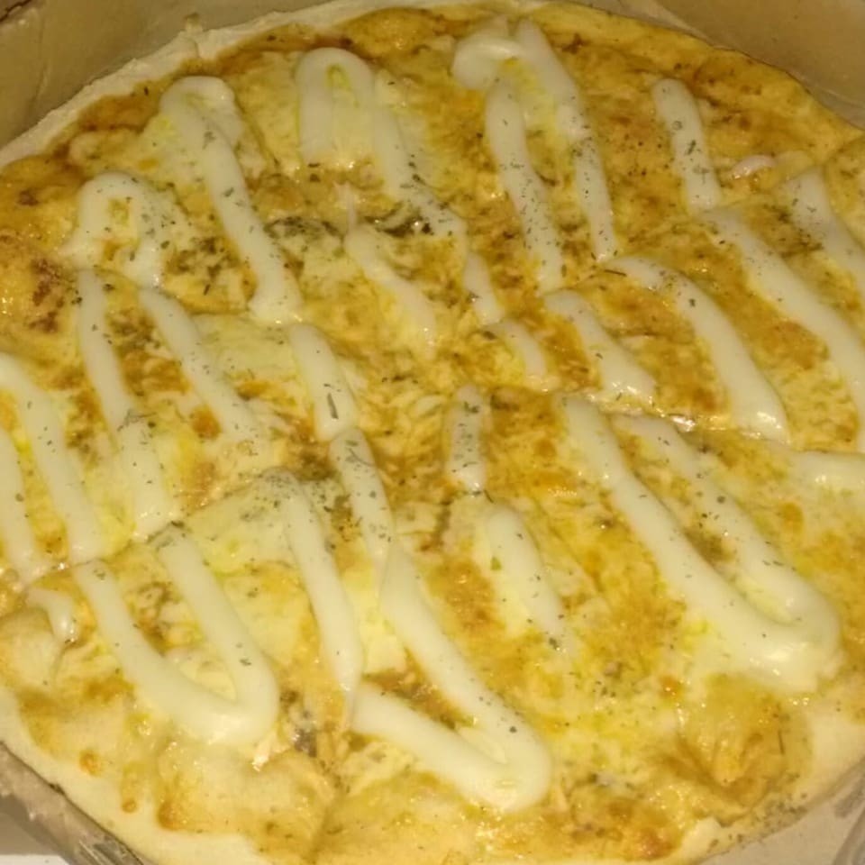 Massa, molho, queijo muçarela, frango desfiado, catupiry e orégano.