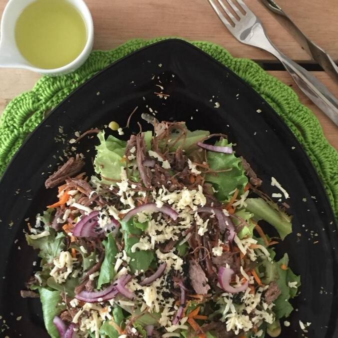 Mix de folhas crocante, cenoura, grão de bico, cebola roxa, suculenta carne de sol