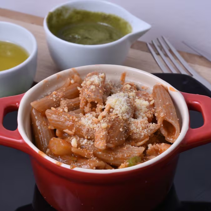 Penne integral de arroz ao molho tomate caseiro com cubos de tomate, queijo branco minas frescal, legumes, champignon e manjericão
