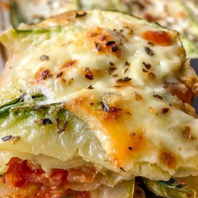 Deliciosa lasanha de abobrinha com molho de tomate e queijo mussarela e manjericão, finalizada com maçarico.